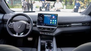Nội thất VF 7 còn được trang bị hệ thống điều hòa tự động 2 vùng, cửa gió cho hàng ghế sau, lọc không khí cabin, sạc không dây (bản Plus), hệ thống 8 loa, HUD hiển thị kính lái, nhiều cổng sạc USB và các hộc chứa đồ tiện ích. Các chi tiết như cần số dạng phím piano, đèn nội thất, rèm che nắng, cửa sổ trời panorama… góp phần nâng tầm trải nghiệm cho người dùng.