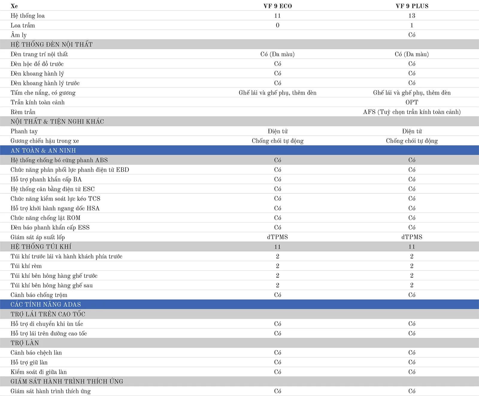 Về an toàn, VinFast VF 9 sở hữu 11 túi khí, hệ thống hỗ trợ lái nâng cao (ADAS) với các tính năng như hỗ trợ lái trên cao tốc, phanh tự động khẩn cấp, cảnh báo điểm mù, cảnh báo va chạm, camera 360 độ, kiểm soát hành trình thích ứng và nhiều công nghệ an toàn chủ động khác.